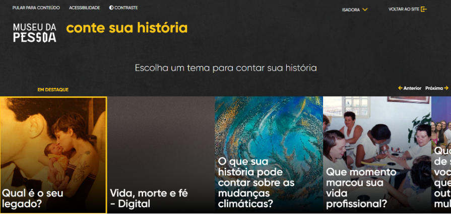 Nessa página, o tema da sua iniciativa será apresentado juntamente ao cardápio de opções desenvolvido pelo Museu, permitindo que o público escolha uma delas para registrar sua história.