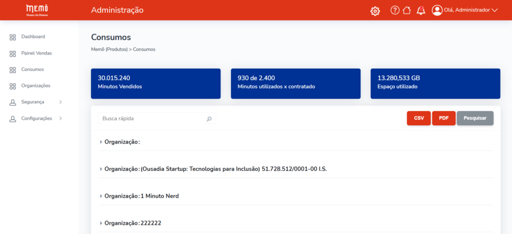 Nesta área, o Museu da Pessoa consegue acompanhar o consumo realizado por cada organização x produto adquirido na plataforma Memô.