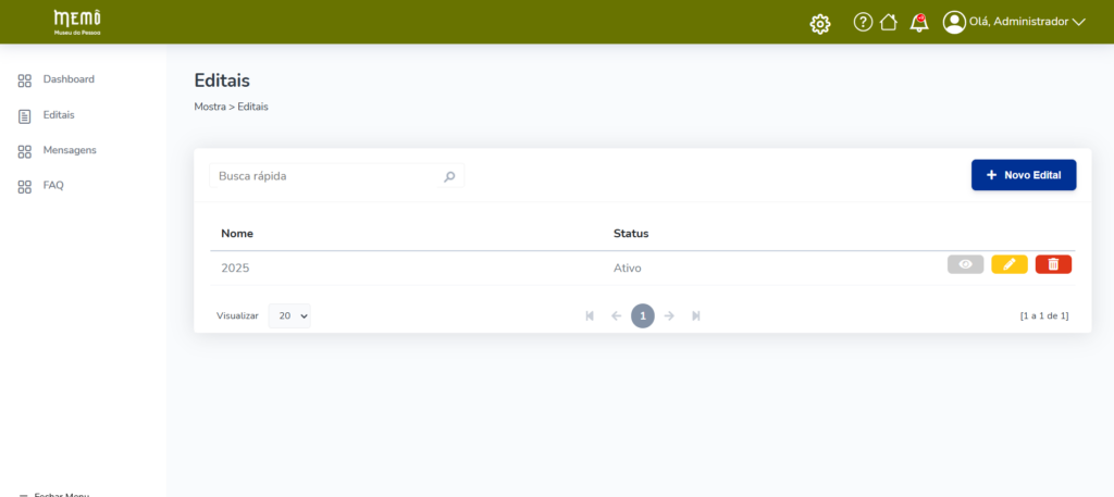 Basta clicar em “Novo Edital”. Para editá-lo, é só clicar no “lápis” de um determinado registro da listagem. Vale ressaltar que só pode haver um único edital ativo.