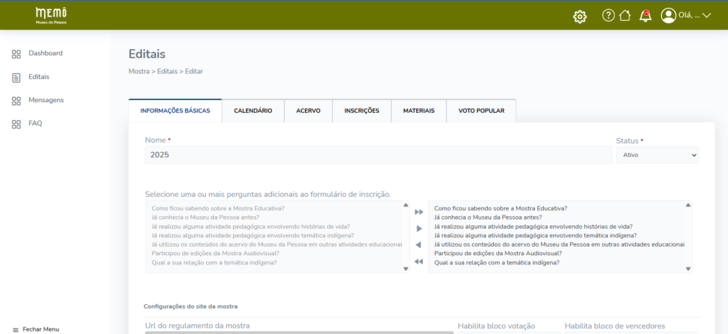 1. Informações Básicas: reúne as configurações gerais do edital, como nome, status, perguntas que serão apresentadas ao usuário no momento da inscrição e a definição sobre habilitar ou não as funcionalidades de votação e indicação de vencedores.
