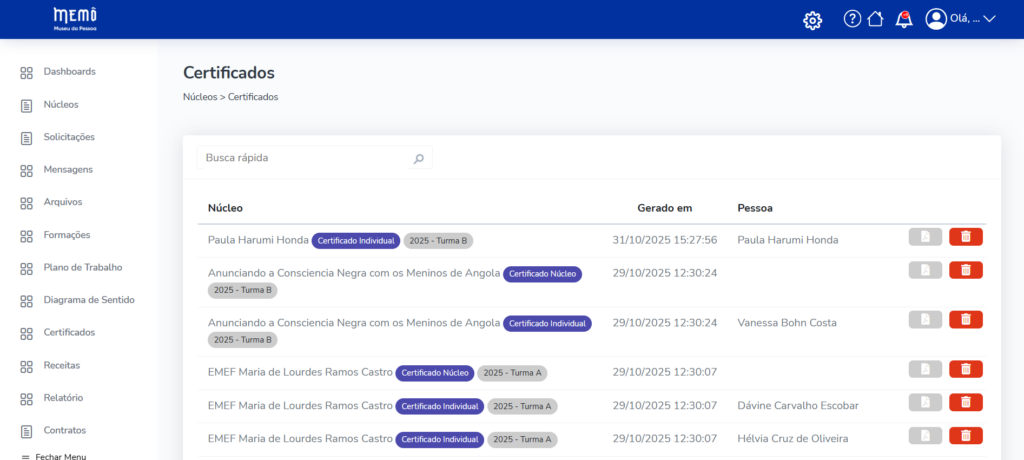A funcionalidade de certificados possibilita ao usuário administrador acessar de forma centralizada todos os certificados gerados para os Núcleos (e seus participantes). Eles podem também ser acessados no próprio cadastro do Núcleo, na aba de Certificados.