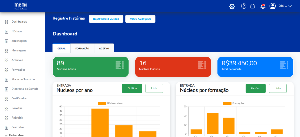 - Acervo: dados relacionados aos acervos dos Núcleos, quantidade de histórias, pessoas e mídias que cada Núcleo criou.