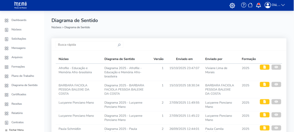 A funcionalidade de Diagrama de Sentido possibilita ao usuário administrador acessar de forma centralizada todos os diagramas enviados pelos Núcleos, independente de qual formação ele participou. Eles podem ser acessados no próprio cadastro do Núcleo, na aba de Diagramas de Sentido.