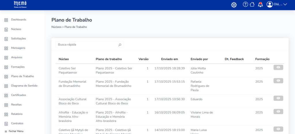A funcionalidade de Plano de Trabalho possibilita ao usuário administrador acessar de forma centralizada todos os planos enviados pelos Núcleos, independente de qual formação ele participou. Eles também podem ser acessados no próprio cadastro do Núcleo, na aba de Plano de Trabalho.